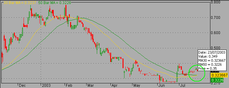line (30 bar MA) crossing up above the green line (50 bar MA) on the
